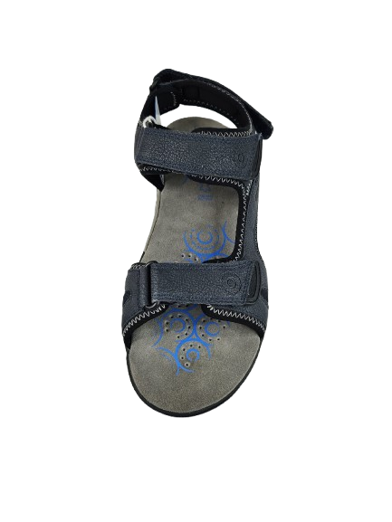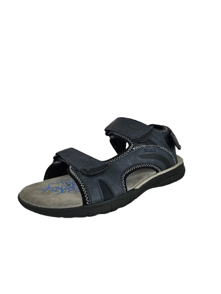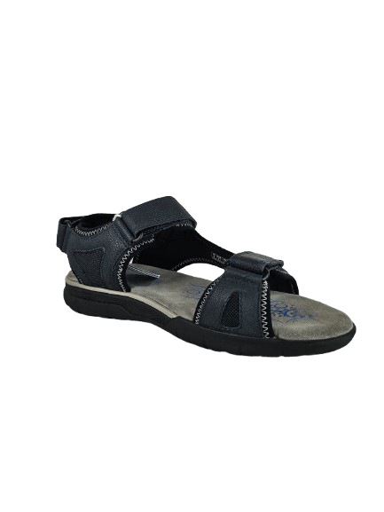 emerges from its open toe and heel and three practical adjustable riptape strips. In a versatile navy-blue